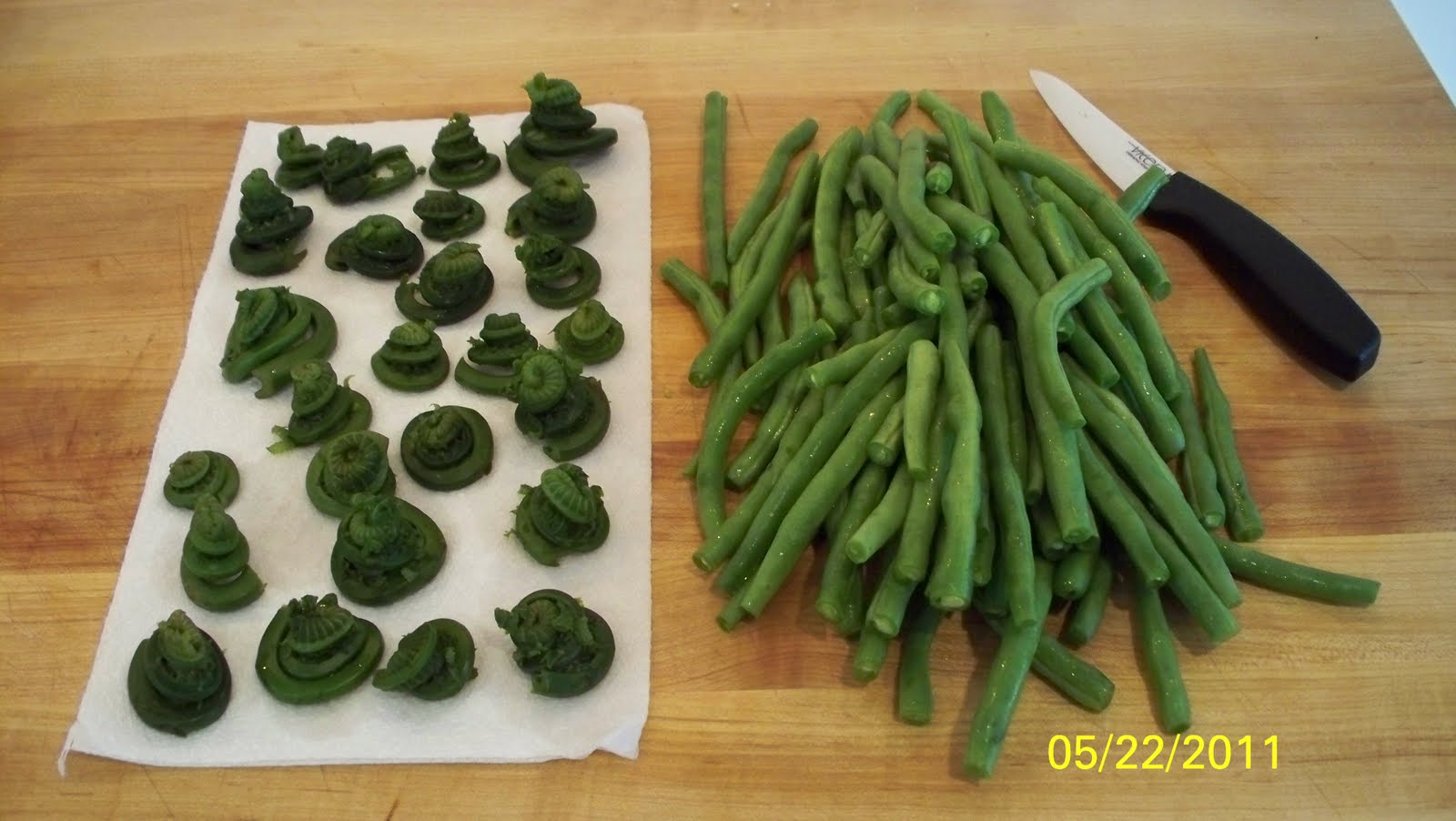 As I mentioned in my last post "Fiddleheads", I think I ruined the flavor of the fiddleheads by boiling them. So I was bound and determined to try them roasted. I will let them share the oven with the green beans.